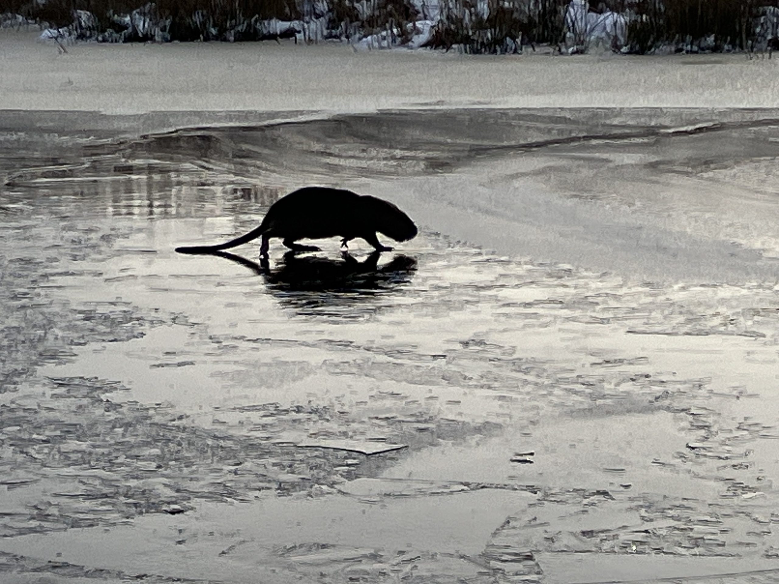 Over het dichtgevroren Eelderdiep loopt een Bever (waarnemer en foto: Fronique Oosterrhof).