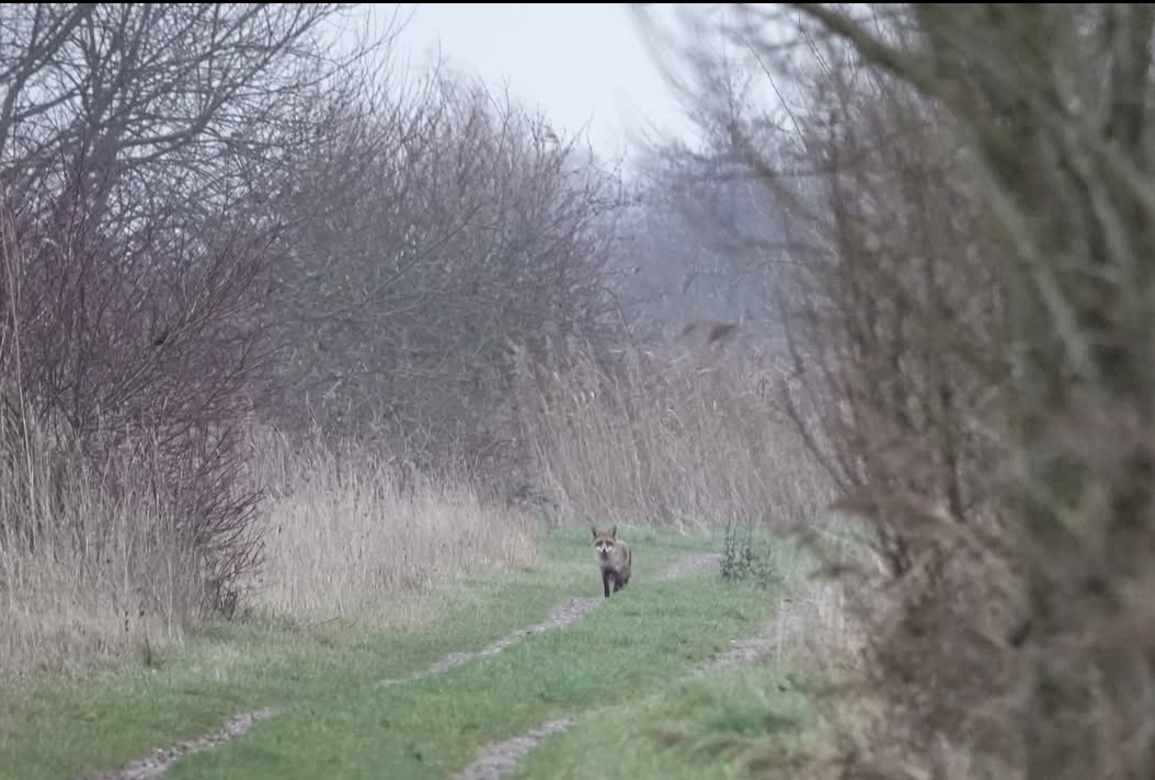 Op de Onlandse Dijk wandelt een Vos. In een struik hier zit de Grijze Wouw (waarnemer en foto: Monique Lommert.