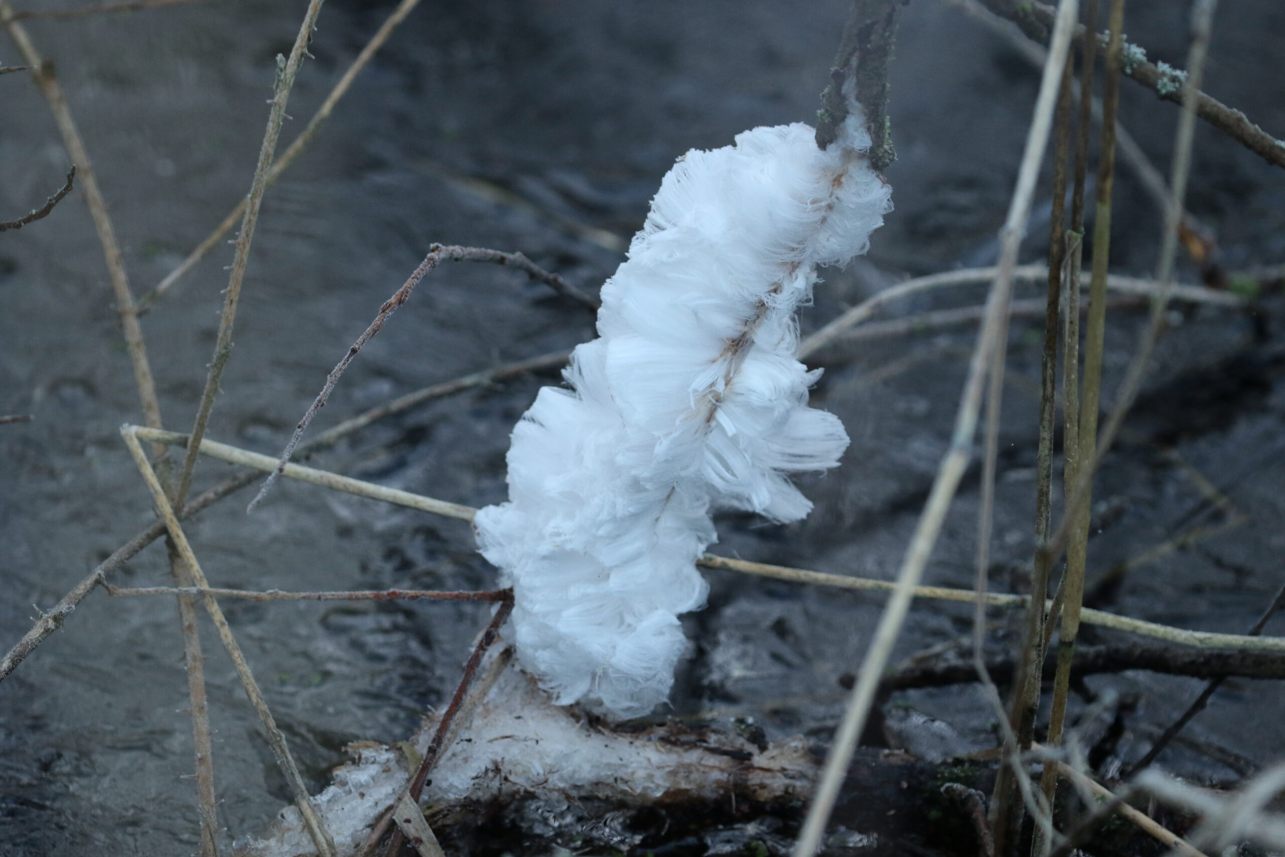 De Blauwvleugeltaling zit nog in de Lettelberter Petten, net als de Siberische Taling. Ook het fenomeen IJshaar is hier te zien (waarnemer en foto: Tseard Mulder).