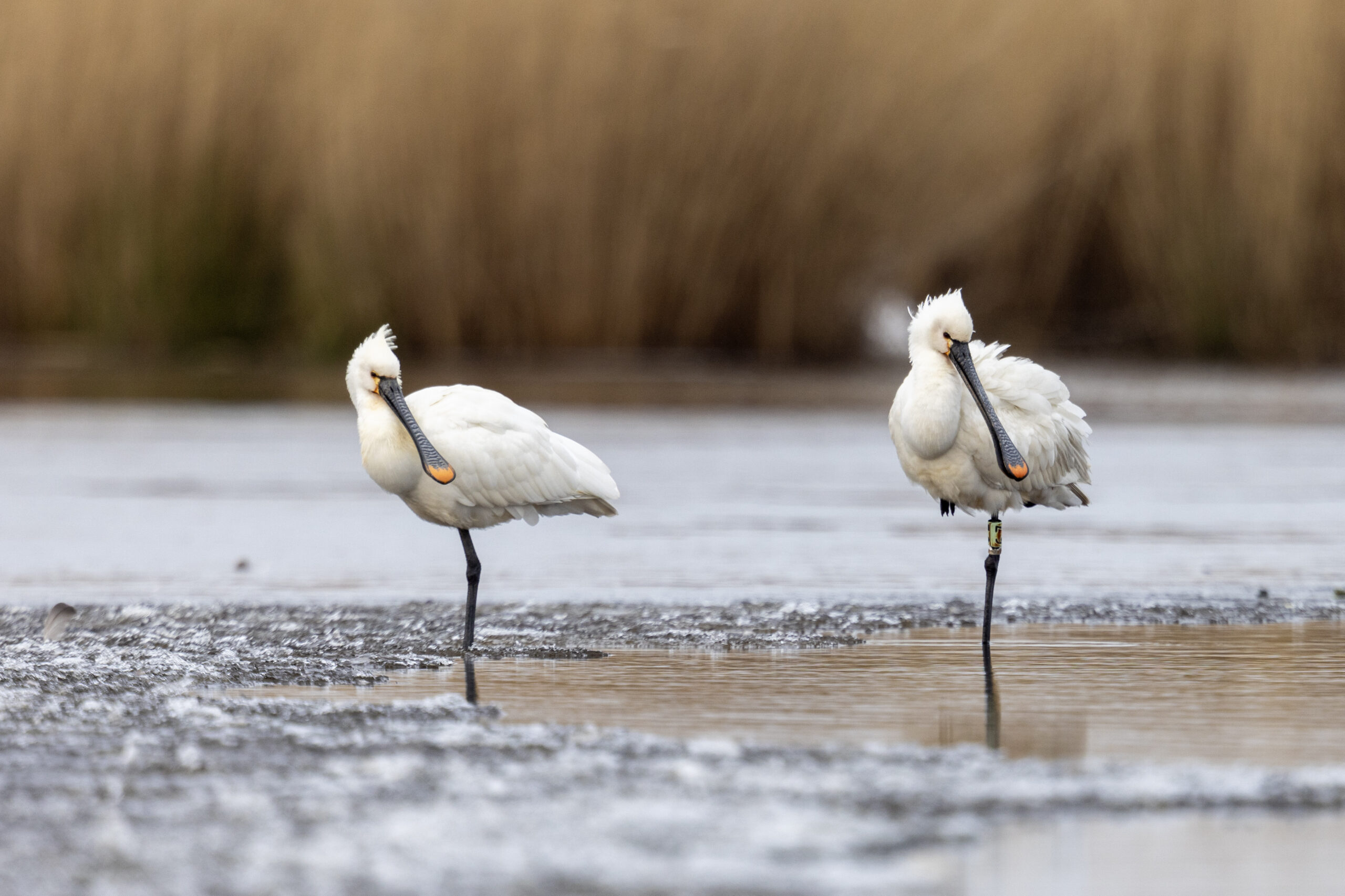 In de Blauwvennen staan twee kleumende Lepelaars. Eentje is in 2003 op Schiermonnikoog geringd (waarnemer en foto: Ane van Rees).