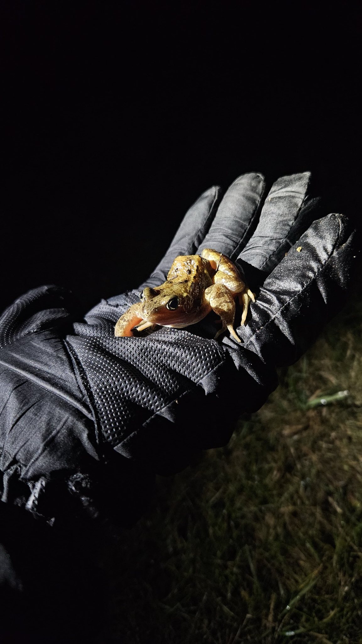 23 februari: Met de opgelopen temperaturen zijn ook de Heikikkers al weer op pad. Nog wat traag, daarom is deze een handje geholpen om het fietspad over te steken (waarnemer en foto: Jan-Hidde Dijk).