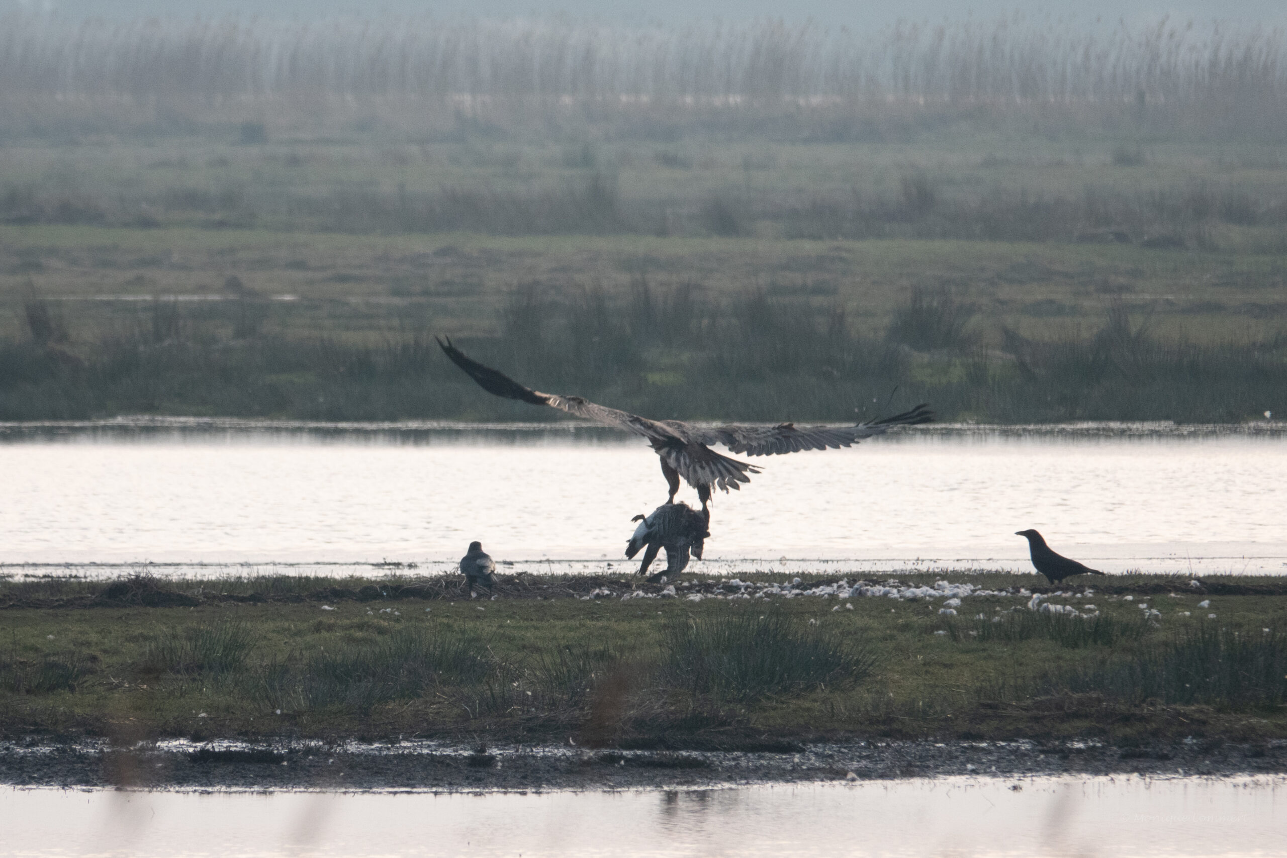 9 februari: Een hybride Grauwe/Grote Canadese Gans wordt geslapen door een paar Zeearenden (waarnemer en foto: Monique Lommert).