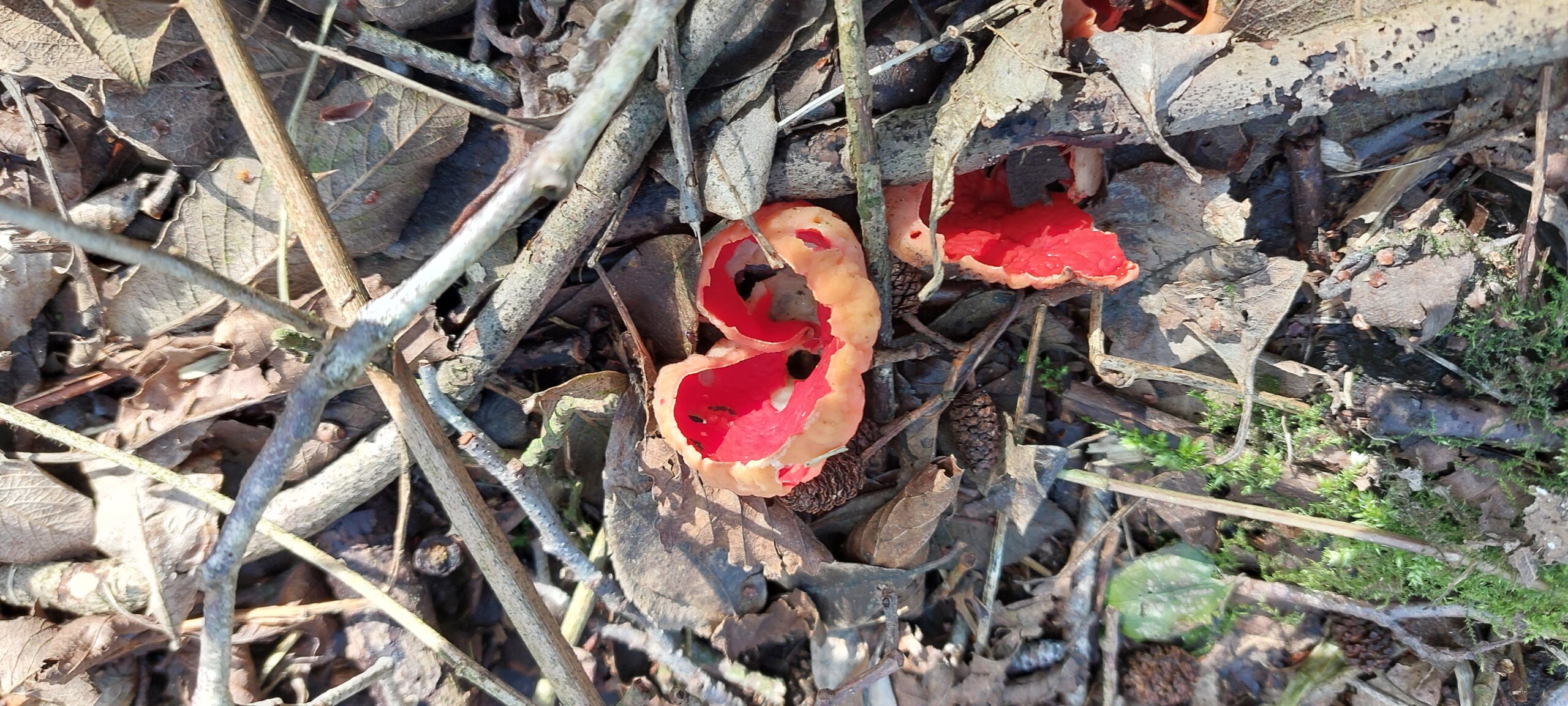 Bij de brug van de Zanddijk staan 8 Lepelaars. In het bos van de Lettelberter Petten is een soort Rode kelkzwam (sl, inclusief Krulhaarkelkzwam) te zien (waarnemer en foto: Jacob Poortstra).